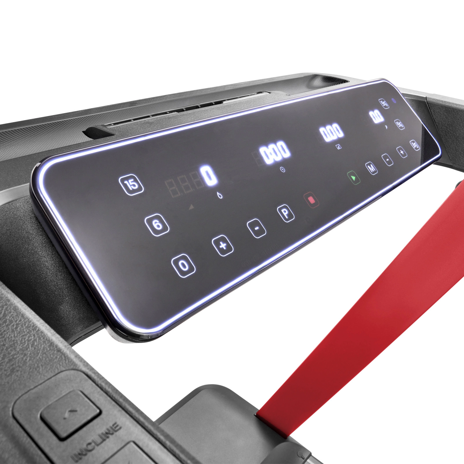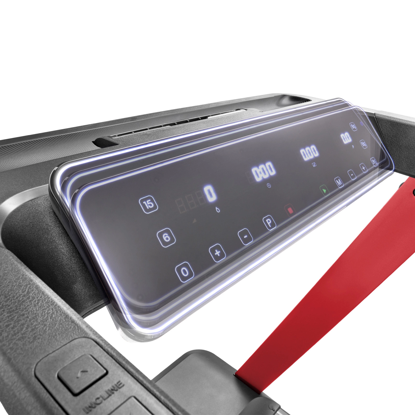 - Intuicyjna konsola LED z regulowanym kątem nachylenia prezentuje wszystkie kluczowe parametry: czas, dystans, prędkość, kalorie oraz tętno.