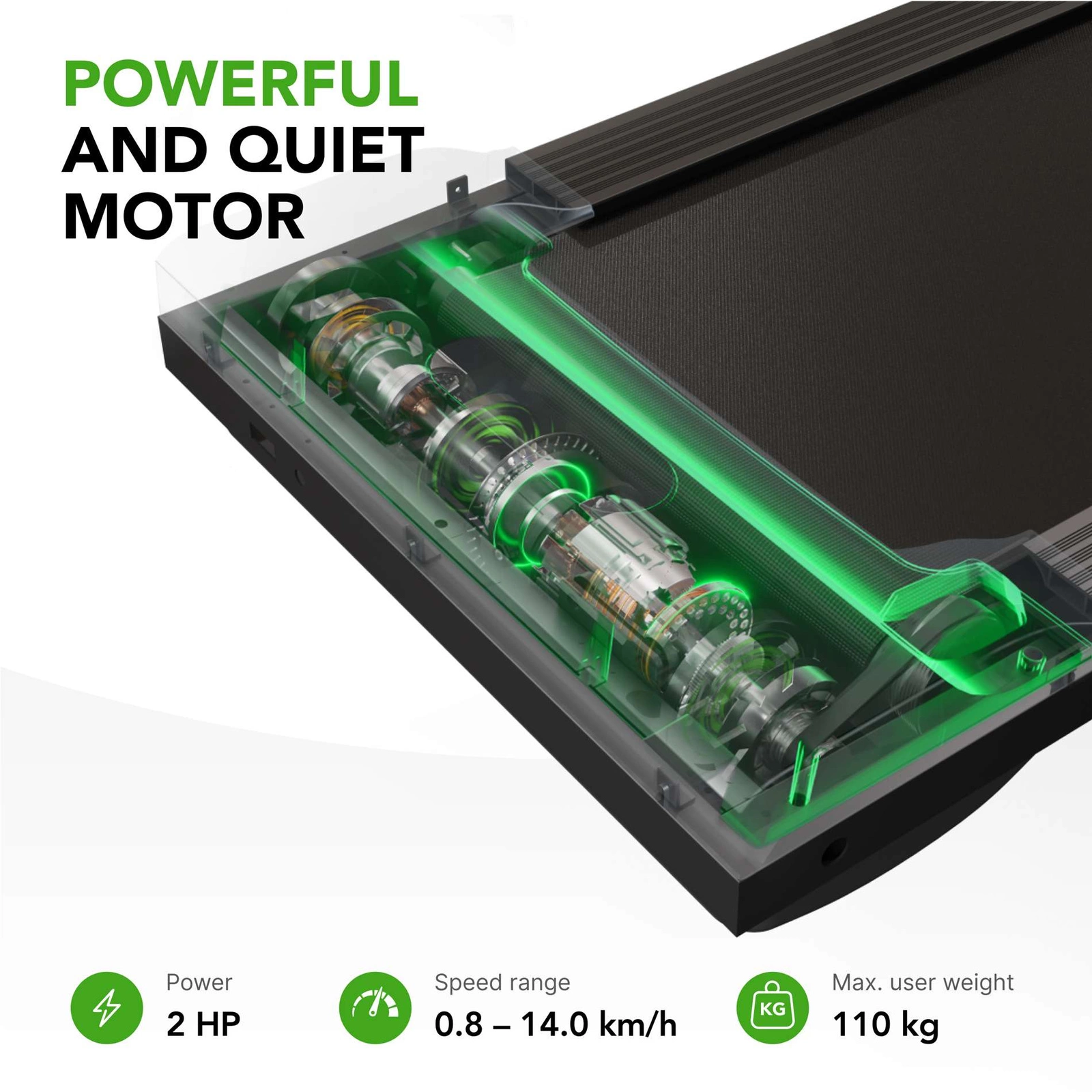 Powierzchnia bieżni zapewnia wygodę podczas chodzenia i biegania, a warstwowa mata amortyzuje uderzenia, chroniąc stawy. Solidna konstrukcja utrzymuje użytkowników o standardowej wadze.