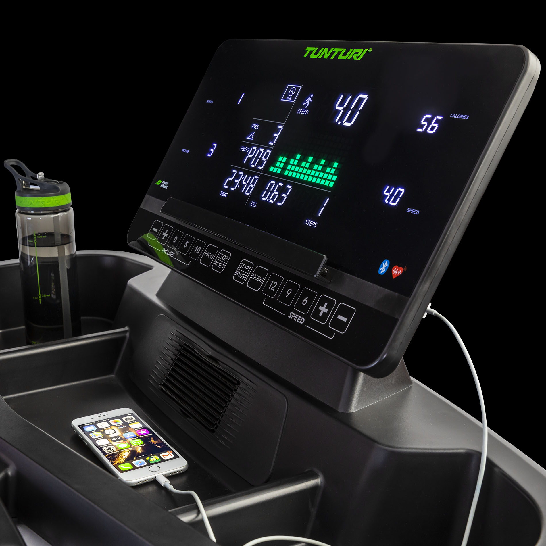 - Kompatybilność z aplikacjami – Możliwość połączenia z Tunturi Routes i Zwift umożliwia interaktywne treningi z realistycznym dopasowaniem nachylenia bieżni do wirtualnych tras.