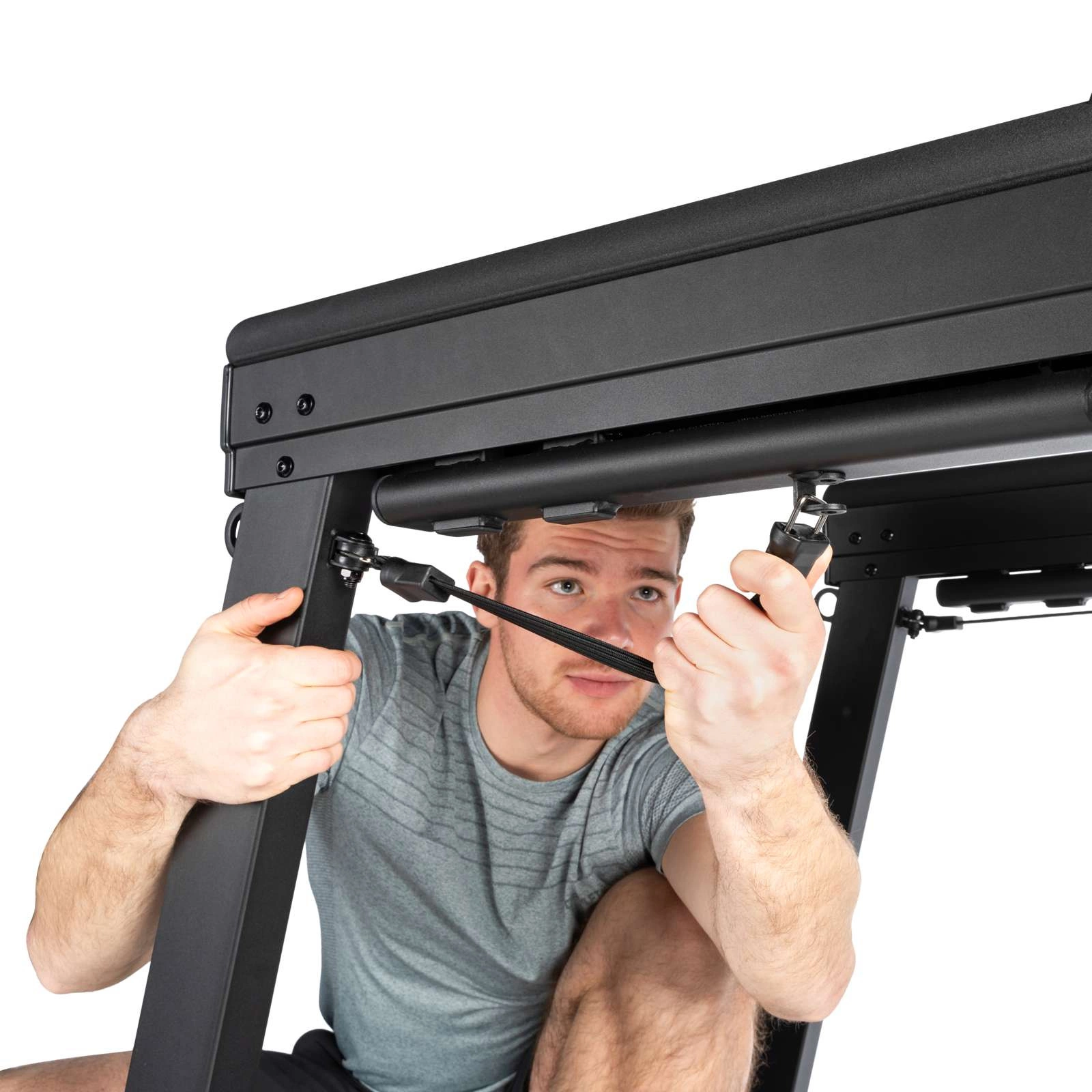 Podczas treningu, pchając lub ciągnąc ciężar za pomocą drążka umieszczonego z przodu bieżni, aktywujesz nie tylko mięśnie nóg, ale także ramion, tułowia, brzucha, dolnej części pleców i pośladków. Drążek w trybie Sled oferuje dwie pozycje – luźną, gdzie drążek porusza się poziomo razem z użytkownikiem, zapewniając dodatkowy opór, oraz stałą, gdzie pozostaje nieruchomy, umożliwiając bardziej stabilny trening. Możliwość przymocowania gum oporowych bungee dodatkowo zwiększa intensywność i różnorodność ćwiczeń, co sprawia, że trening jest jeszcze bardziej wymagający i efektywny.