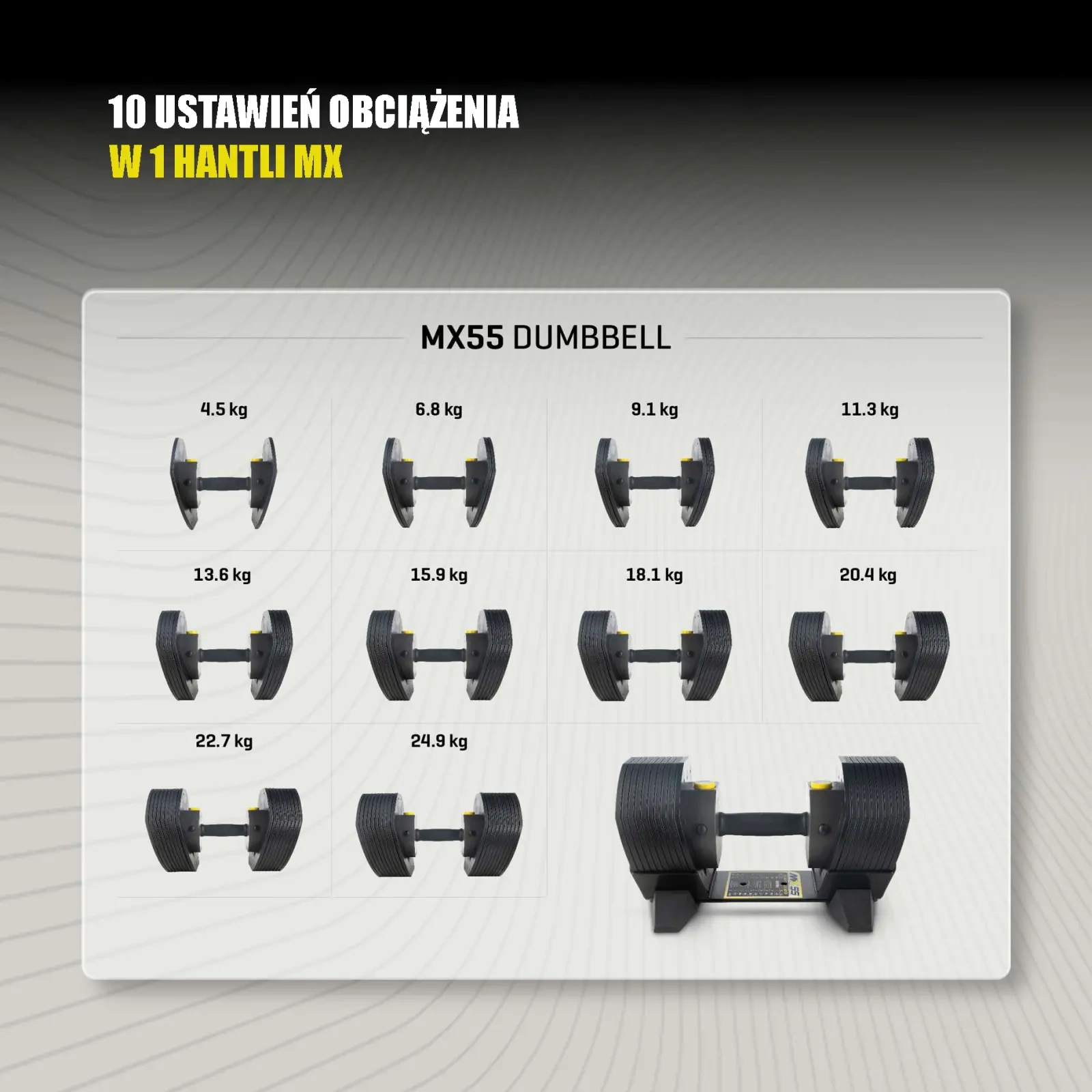 Za mało miejsca w domu? Za mało czasu na trening? Zbyt skomplikowane ćwiczenia? Zapomnij o takich wymówkach! Poznaj i przetestuj innowacyjne hantle regulowane MX SELECT MX55, a już nigdy nie wrócisz do zmiany żeliwnych krążków, dokręcania śrub czy dociskania zacisków.