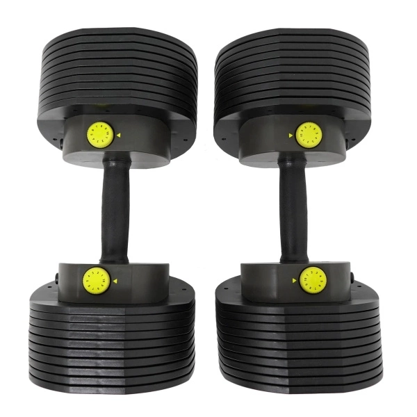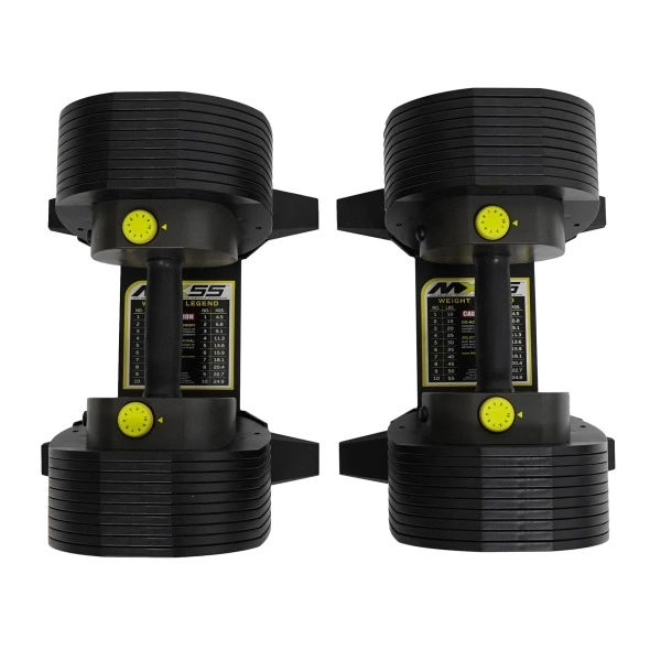 Dzięki prostej i szybkiej regulacji obciążenia, hantle są doskonałe zarówno dla mężczyzn jak i kobiet. Aby zmienić ciężar hantli należy nacisnąć przycisk (po kolei z jednej i z drugiej strony), który wysunie żółte pokrętło do góry. Następnie kręcąc pokrętłem należy wybrać jeden z 10 poziomów obciążenia, wcisnąć żółte pokrętła po obu stronach i podnieść hantle.DLACZEGO HANTLE REGULOWANYCH MX SELECT MX55?