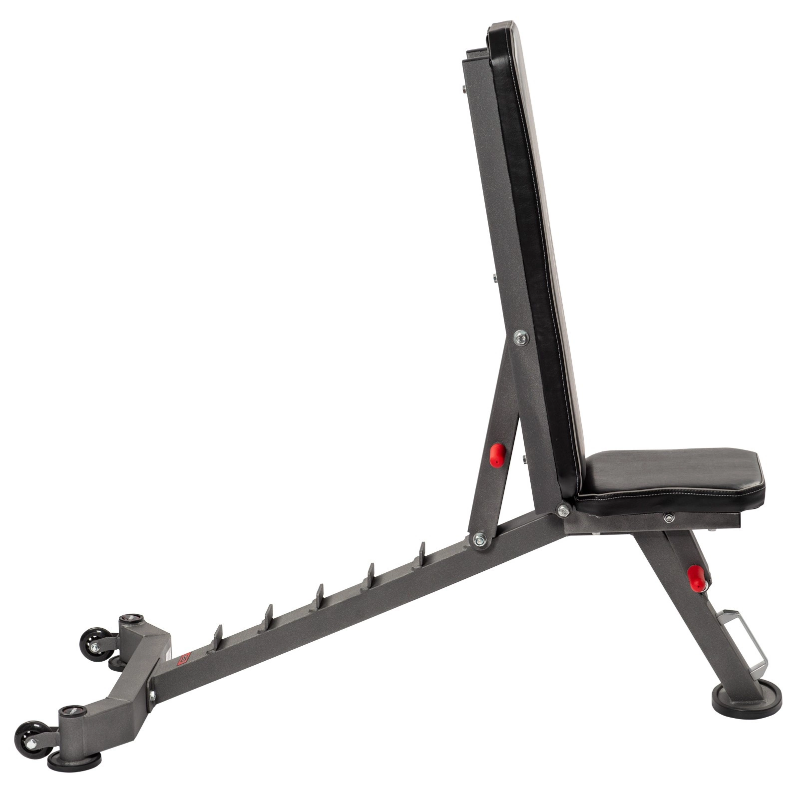 • Praktyczny transport: Rolki transportowe i uchwyt pod siedziskiem umożliwiają łatwe przemieszczanie ławki w domowej siłowni.
