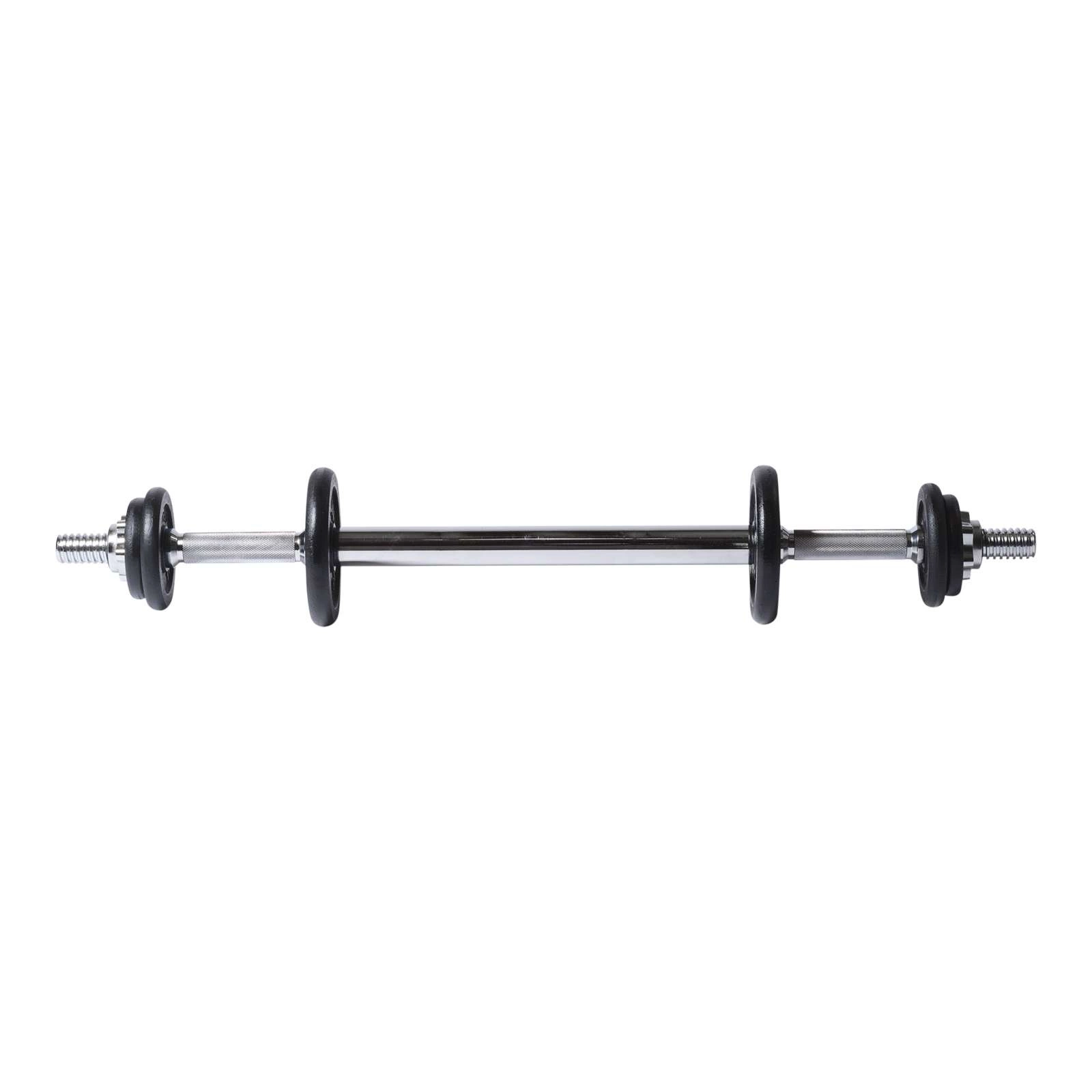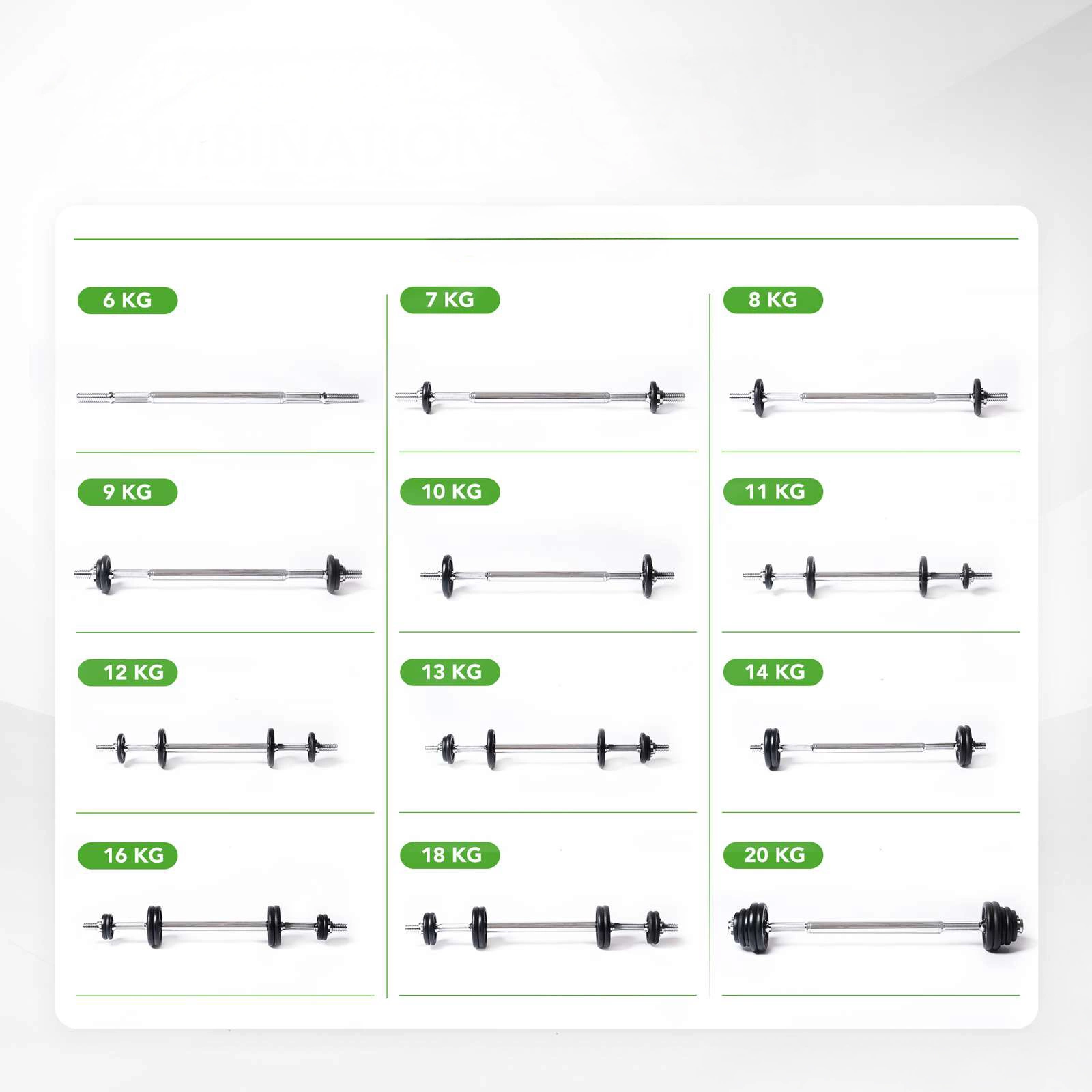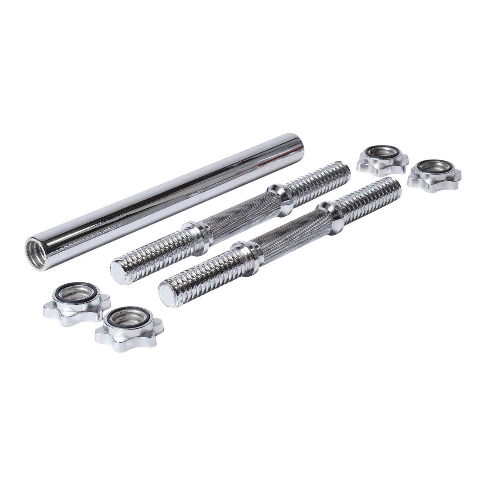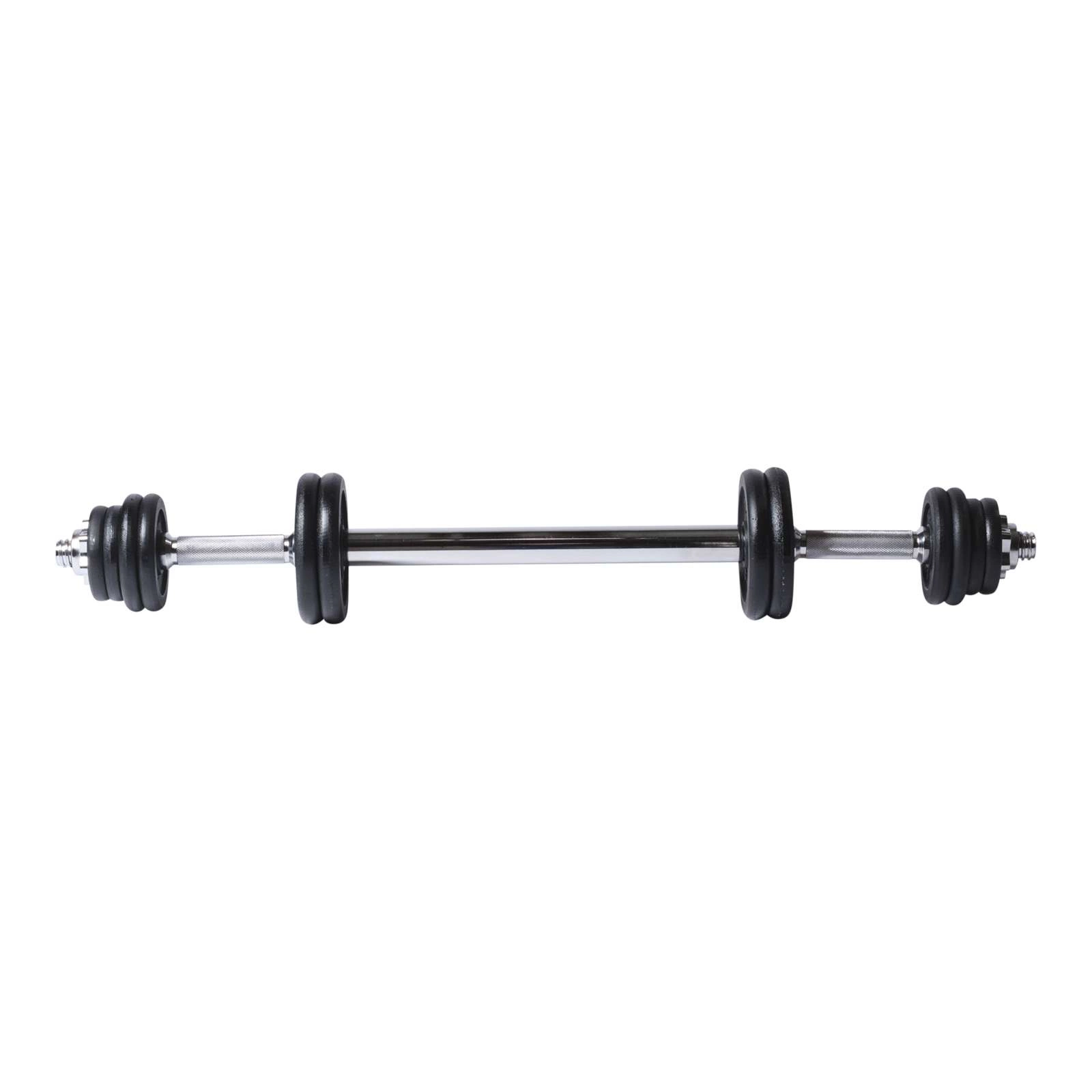 Zestaw oferuje 12 opcji ciężaru dla sztangi (6–20 kg) oraz 8 dla hantli (2–9 kg na jeden hantel). Dzięki temu możesz łatwo zmieniać poziom trudności, dopasowując trening do swoich celów i możliwości. Solidne, chromowane gryfy oraz poręczne nakrętki (30 mm) umożliwiają szybką i bezproblemową wymianę obciążenia.