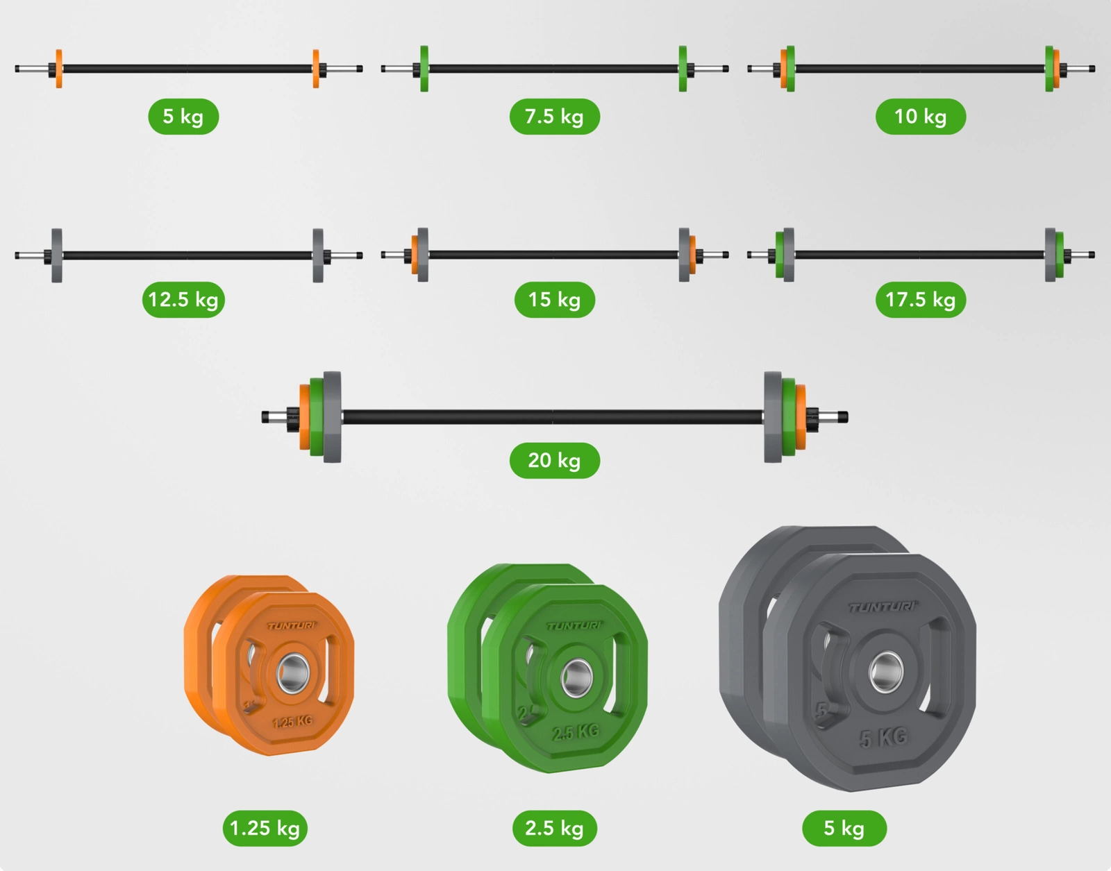 Zestaw Tunturi umożliwia szeroką gamę ćwiczeń - od przysiadów i martwego ciągu, po wyciskanie i ćwiczenia z samymi talerzami. Dzięki różnym obciążeniom (1,25 kg, 2,5 kg i 5 kg) możesz stopniowo zwiększać poziom trudności, dopasowując trening do własnych możliwości.Talerze wykonano z wytrzymałego metalu, który nie odkształca się i zachowuje swoją wagę - nawet przy intensywnym użytkowaniu. Gumowa powłoka zapewnia dobrą przyczepność, chroni podłogę i ułatwia czyszczenie. Kanciaste kształty zapobiegają turlaniu się sztangi po zakończeniu ćwiczeń.