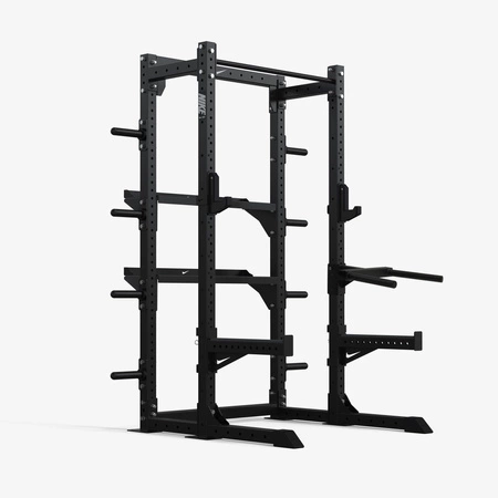 Nike Half Rack to idealne połączenie funkcjonalności klatki do przysiadów i systemu przechowywania obciążeń. Dzięki wbudowanym hakom na talerze, wszystkie ciężary masz zawsze pod ręką, co znacząco skraca przerwy między seriami. Konstrukcja racka pozwala zaoszczędzić miejsce, jednocześnie nie ograniczając funkcjonalności – sprawdzi się zarówno w domowej siłowni, jak i w komercyjnej przestrzeni treningowej. W zestawie znajdziesz nowo zaprojektowane uchwyty J-Cups, które chronią gryf i zwiększają maksymalne obciążenie. Rack wykonany został z wytrzymałej stali, co zapewnia trwałość na lata – nawet przy intensywnym użytkowaniu. Do dyspozycji masz także dodatkowe akcesoria: ramiona asekuracyjne i stację do dipów, które zwiększają bezpieczeństwo i funkcjonalność treningu.
